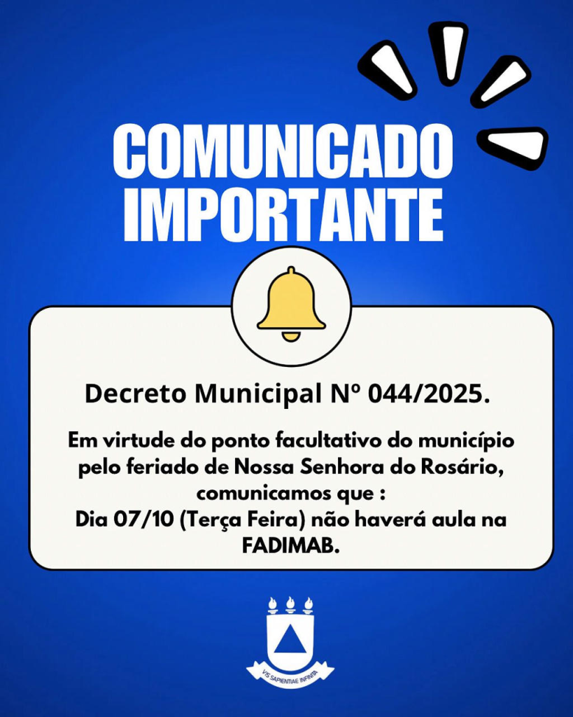 Porém, amanhã, 07 de outubro, não haverá aula devido ao feriado de Nossa Senhora do Rosário, conforme o Decreto Municipal Nº 044/2025.